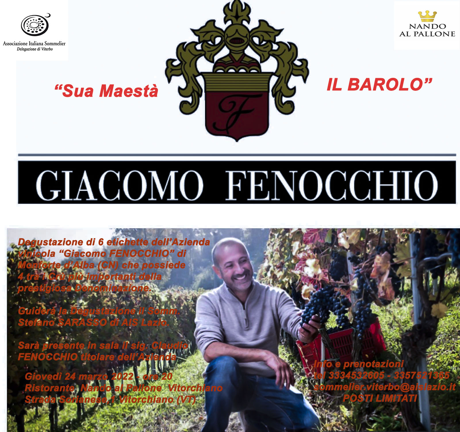Il BAROLO sarà il protagonista il giorno 24 marzo 2022, alle ore 20 presso il Resort Ristorante Nando al Pallone in Vitorchiano dove si svolgerà un interessantissimo ed esclusivo evento di Degustazione di n. 6 etichette dell’Azienda vitivinicola “GIACOMO FENOCCHIO” di Monforte d’Alba che possiede 4 tra i Crù più esclusivi della prestigiosa Denominazione.